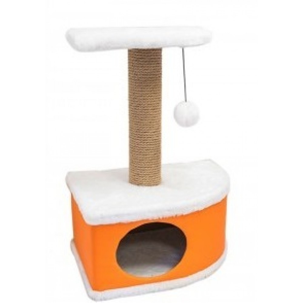 Домик-когтеточка угловой формы с квадратной полкой, на которую подвешен помпон в цвет домика. Изготовлен из ДСП и фанеры, обработанные искусственным мехом и кожей. Столбик-когтеточка обработан джутом. Благодаря простоте формы и цветовым оттенкам домик легко впишется в любой интерьер. Для удобства в перевозке, домик легко собирается и разбирается. В комплект входят инструкция и ключ для сборки.