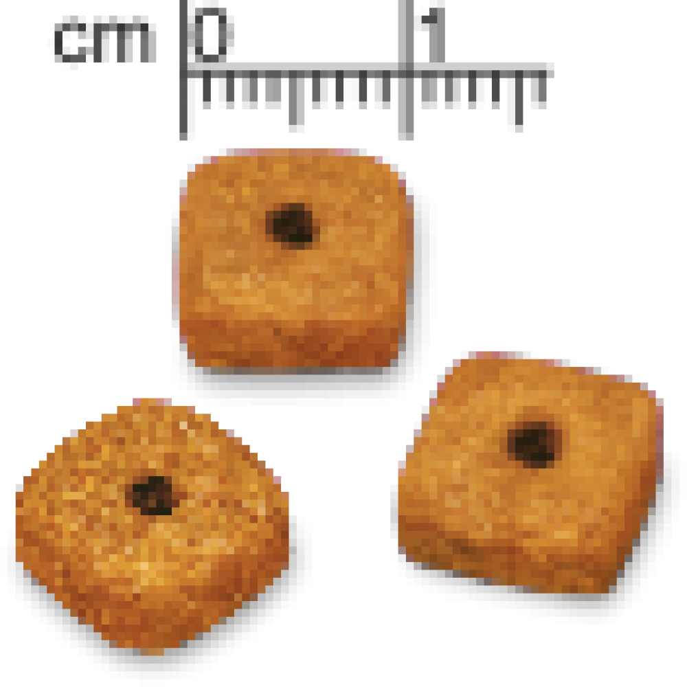 Состав: обработанный животный белок, кукуруза, животный жир, рыбная мука лосося, рыбий жир, кукурузный глютен, рис, сушеная сахарная свекла, аромат печени, рыбный аромат, соль, льняное семя, сушеные пивные дрожжи, таурин, MOS (Mannan Oligo Saccarid), бета глюканат, Юкка, Куиллая. Минералы: кальций, фосфор, натрий, йод, цинк, медь, хлорид калия, железо, селен. Витамины: Вит. А, Вит. Д, Вит. Е, Вит. С, вит. B1 - B2 - B3 (ниацин) - B6 - B12 - B7 (биотин) - B9 (фолиевая кислота), вит. К, холин, кальций пантотетан.