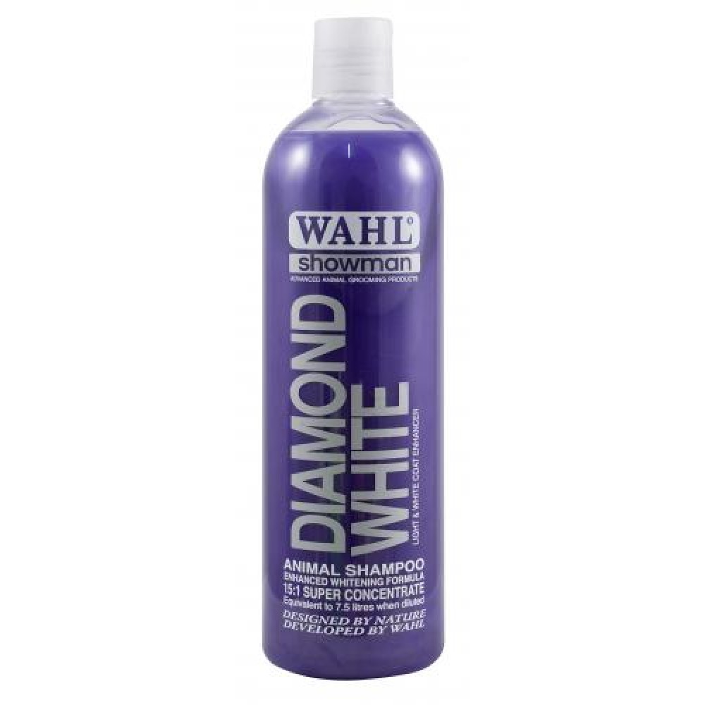 Wahl Diamond White Shampoo. Профессиональный концентрированный шампунь. Не содержит вредных и опасных веществ. Основан на натуральных экстрактах огурца, лимона, лайма, страстоцвета. Эффективен к применению на белой и другой светлой шерсти для удаления грязевых и жировых отложений. Восстанавливает натуральную пигментацию и освежает цвет шерсти, придает ей здоровый, шелковистый вид. Применяется для собак, кошек, лошадей, лам, овец, кроликов, хорьков и др.