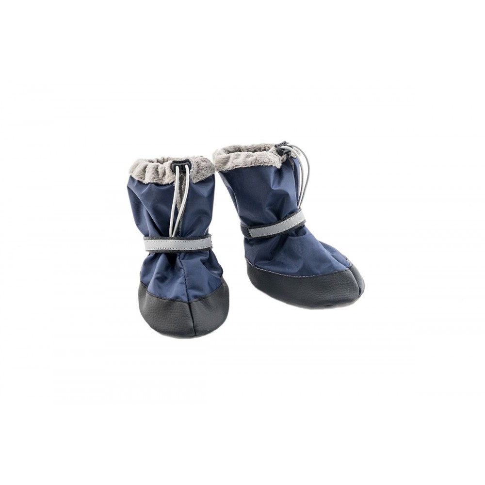 Обувь мягкая, утепленная мехом, для собак и кошек, со светоотражающим элементом. Используется для прогулок, защищая лапы от холода, грязи, снега и случайных порезов. А также для защиты больной (или перевязанной) лапы от разлизывания, загрязнения и возможных повреждений. Обувь отшита из водонепроницаемой ткани (оксфорд) тёмно-синего цвета, внутри утеплена искусственным мехом. Низ обуви дополнительно защищен экокожей, а подошва выполнена трехслойной с латексным покрытием для предотвращения скольжения. Обувь фиксируется на лапе с помощью липучки (велькро) и регулирующегося по длине эластичного шнурка. Для определения размера поставьте лапу собаки (кошки) на лист бумаги и обведите её карандашом, замерьте длину и ширину получившегося контура и подберите соответствующий размер по таблице на упаковке.