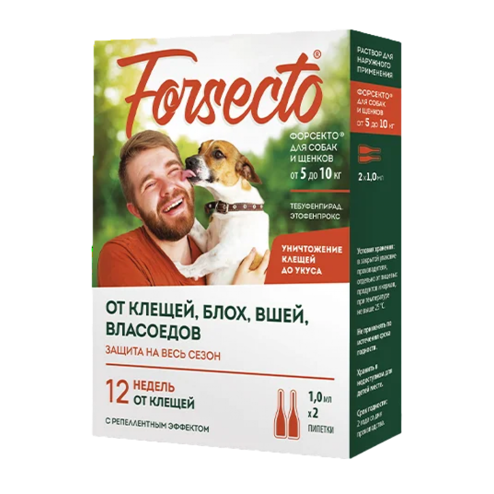 Упаковка лекарственного препарата ФОРСЕКТО содержит две пипетки для обеспечения защиты от иксодовых клещей на сезон со средней продолжительностью 10 недель у кошек и 12 недель у собак и щенков; от вшей, блох и власоедов на период со средней продолжительностью 14 недель у кошек и 16 недель у собак и щенков.