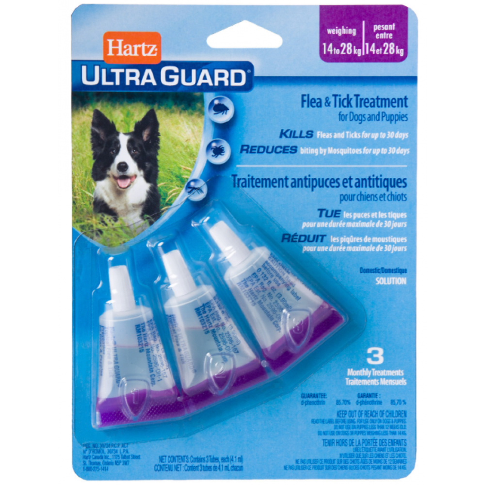 Hartz капли 3 в 1 уничтожают блох, клещей и комаров, которые находятся на собаке и предотвращает их появление в течении 30 дней. Для собак и щенков весом 14-27 кг.