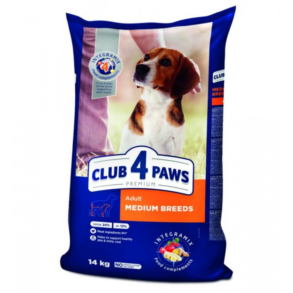 Club 4 Paws сухой корм для взрослых собак средних пород. Полноценное сбалансированное премиум питание для взрослых собак средних пород. В состав рациона входят мясные ингредиенты. Он обогащен всеми необходимыми витаминами и минералами, комплексом Омега 3 + Омега 6 и формулой ІNTEGRAMIX для прекрасного вида и здоровья вашего любимца.