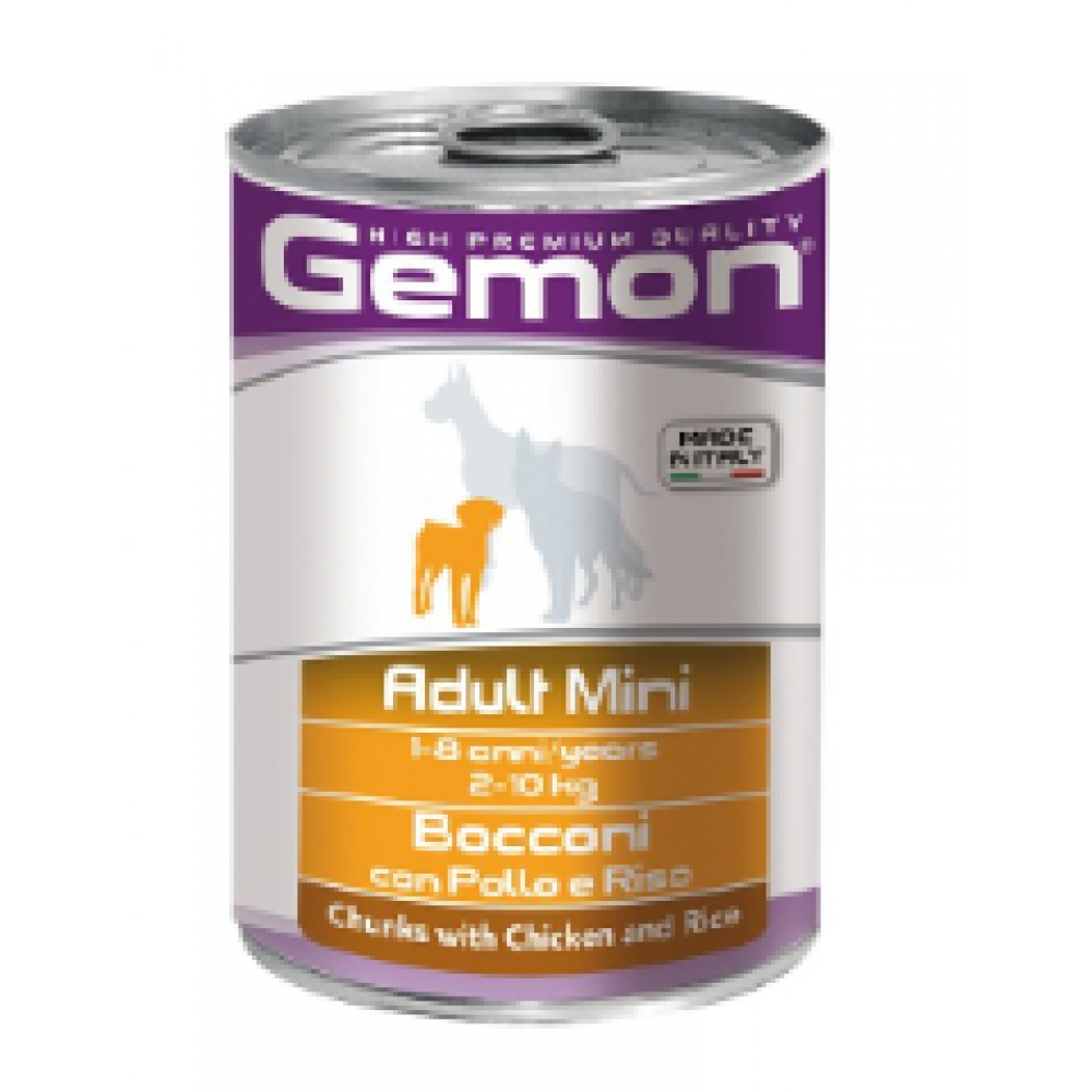 Gemon Dog mini - консервы для собак маленьких пород. Ж/Б 415 г. Полноценный, сбалансированный консервированный корм для собак с кусочками курицы, индейки и рисом. Специально разработан для ежедневного кормления взрослых собак мелких пород (2-10 кг) с нормальной физической активностью в возрасте 1-8 лет.