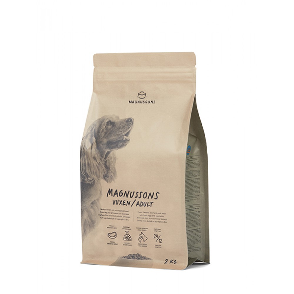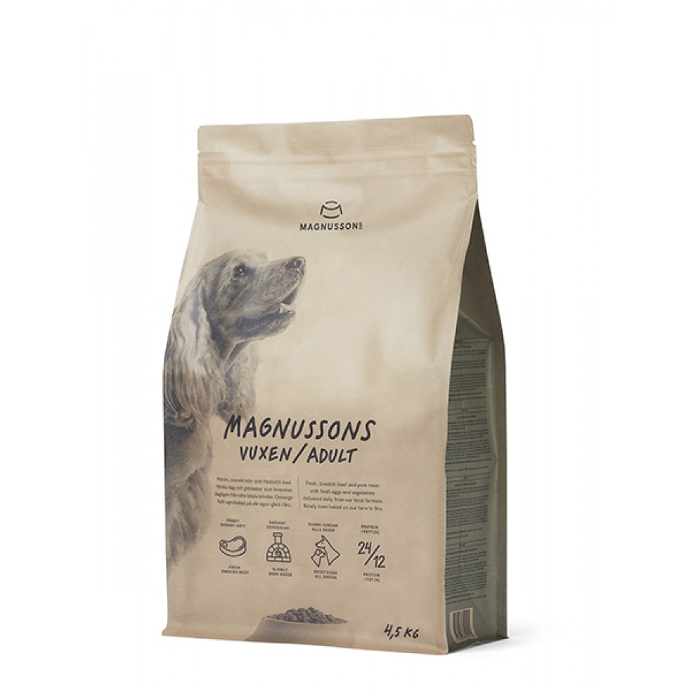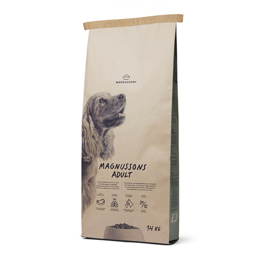 Magnussons Adult - сухой корм для взрослых собак с нормальной и высокой активностью. Рацион для выращивания собак крупных пород. Корм запеченный в духовке с любовью на ферме в Бро. Сделано из органических местных ингредиентов и свежего шведского мяса.