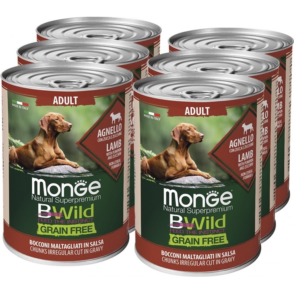 Monge BWild Lamb - консервы для собак с ягненком. Беззерновой корм. Банка 400 гр. Сбалансированный рацион для всех пород собак. Разработан с учетом физиологических потребностей питомцев с использованием альтернативных источников беззлаковых углеводов, таких как, тыква и цуккини. Формула содержит новое поколение пребиотической клетчатки Х.О.S., что помогает сохранить естественный баланс кишечной микрофлоры и способствует оптимальному усвоению питательных веществ. Рацион содержит глюкозамин и хондроитин, которые благотворно влияют на здоровье суставов и всего опорно-двигательного аппарата собак. Ягненок является источником белка. Спирулина как природный источник кальция и витамина В12 поддерживает здоровье сердечно-сосудистой системы и опорно-двигательного аппарата, обладает противоаллергическим и противовоспалительным действием. Выводит токсины из кишечника, улучшает обмен веществ и понижает уровень холестерина. Рацион содержит свежие ягоды, что является натуральным источником витаминов. Юкка Шидигера природный антиоксидант, способствует нормальной работе кишечника. Подходит для собак всех размеров.