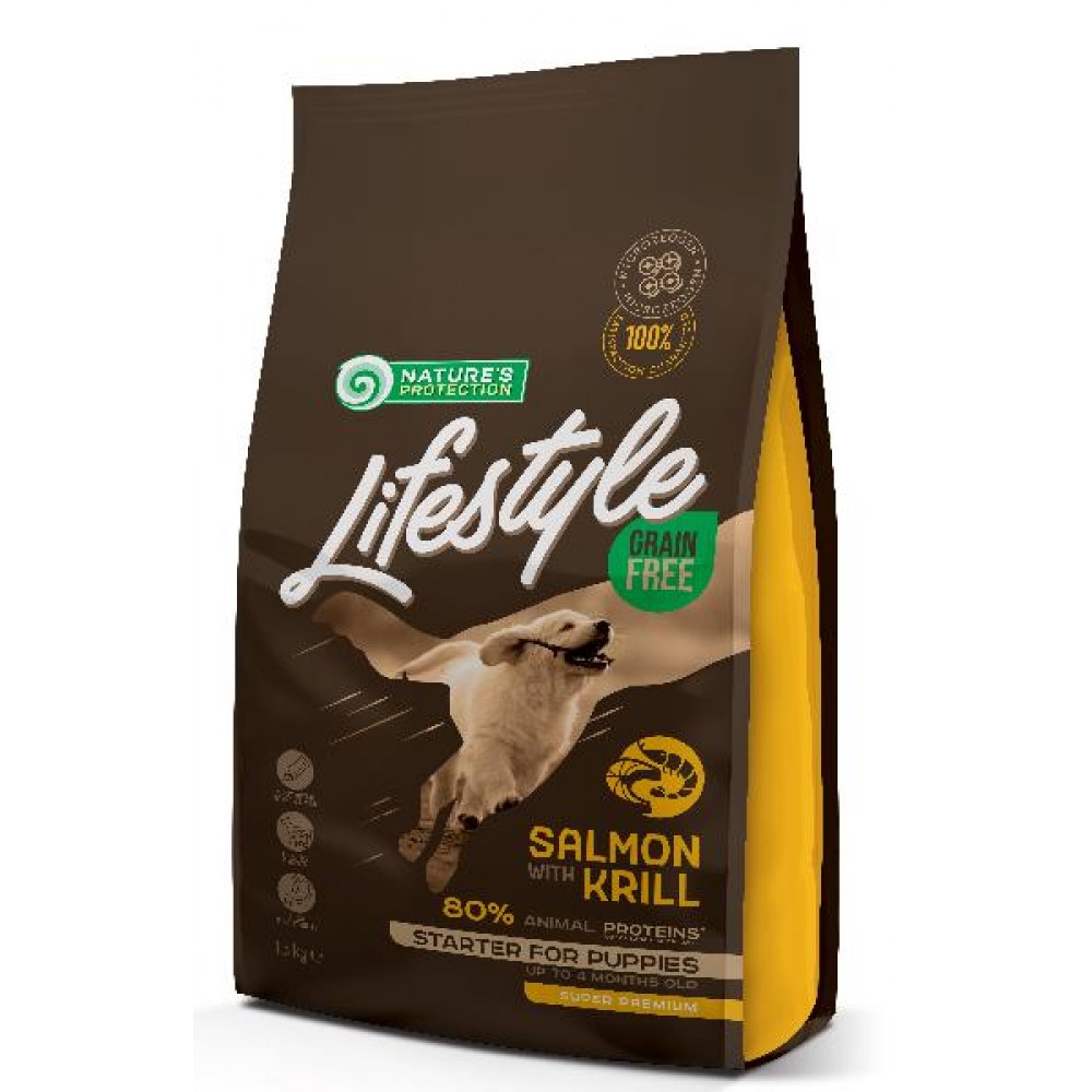 Nature's Protection Lifestyle Starter Puppy Salmon with krill (Лосось и криль) - это полно рационный без зерновой корм для отлучаемых от матери щенков (в возрасте до 4 мес.) всех пород с лососем и крилем. Подходит для беременных и кормящих самок.