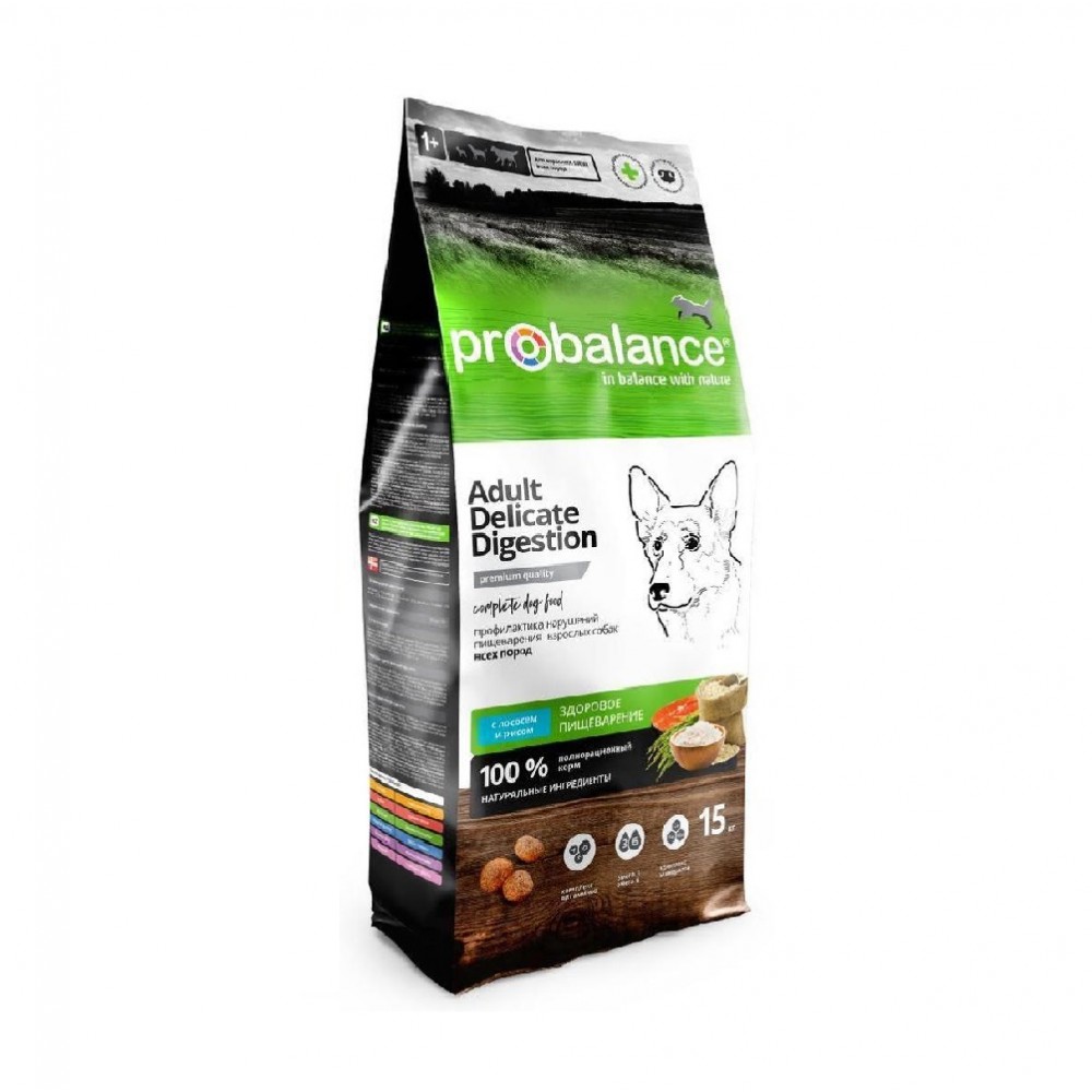 Сухой корм для собак - ProBalance Delicate Digestion с лососем и рисом. Упаковка 15 кг. Корм для собак с нарушением пищеварения со вкусом лосося. Премиальный класс. Кормление нормализует работу желудка, устраняет симптомы пищевых расстройств. Пребиотики, находящиеся в корме, облегчают процесс переваривания пищи. Delicate Digestion не содержит искусственных ароматизаторов и красителей.
