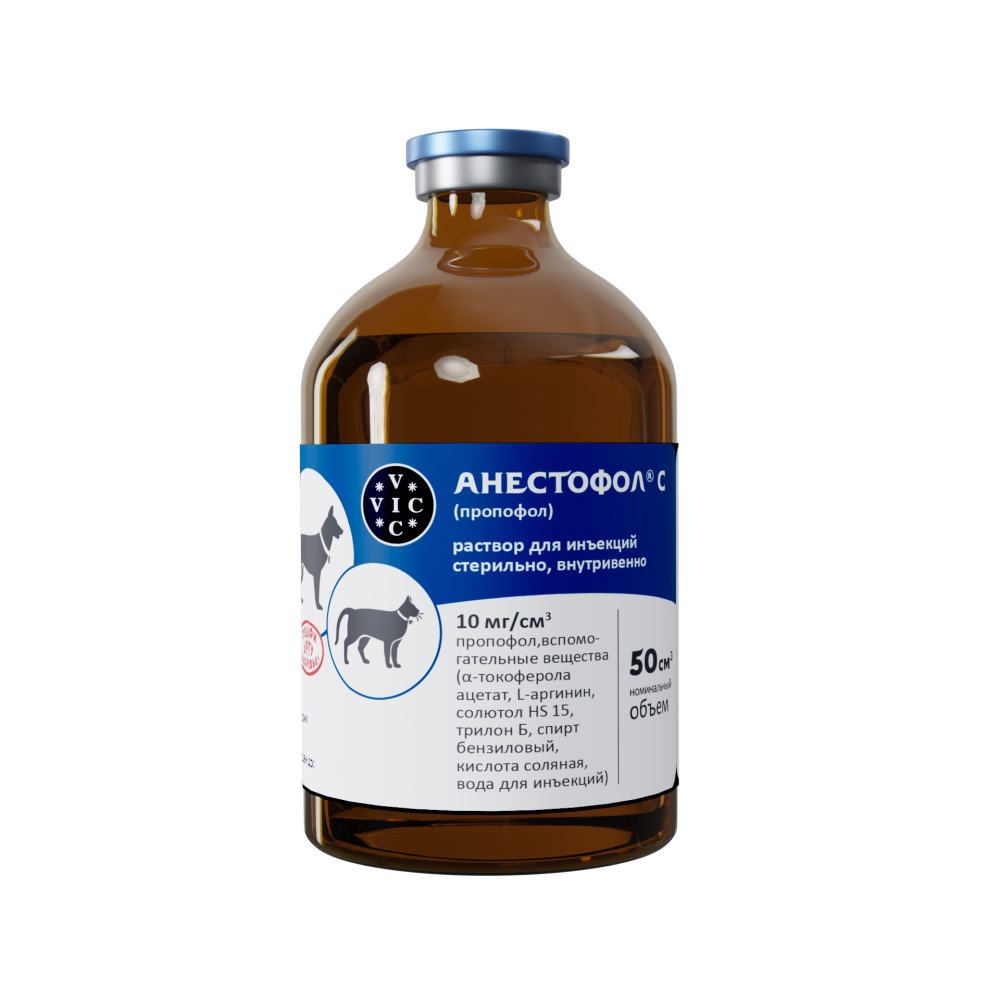Анестофол С (Anestopholum С) пропофол - раствор для инъекций. Препарат представляет собой бесцветную, прозрачную жидкость, допускается опалесценция. В 1,0 см3 препарата содержится 10 мг пропофола, вспомогательные вещества (α-токоферола ацетат, L-аргинин, солютол HS 15, трилон Б, спирт бензиловый, кислота соляная, вода для инъекций). Анестофол С выпускают в стеклянных флаконах по 50 см3. Препарат хранят с предосторожностью (список Б) в закрытой упаковке производителя при температуре от плюс 10 °С до плюс 25 °С, в защищенном от прямых солнечных лучей месте. При хранении при температуре около 10 °С возможно образование мелкокристаллического осадка, который растворяется при температуре 20-25 °С в течение 3-4 часов или при температуре 38-40 °С в течение 30-40 минут и не влияет на качество препарата.