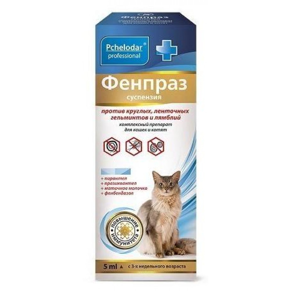 Фенпраз Суспензия для кошек и котят комплексный антигельминтик с маточным молочком для кошек и котят. Обладает широким спектром действия и уничтожает круглых и ленточных гельминтов на всех стадиях их развития. Активные компоненты препарата Фенпраз помогают мягко и безопасно избавить организм животного от гельминтов и продуктов их жизнедеятельности. Натуральное маточное молочко, содержащее в своем составе витамины, минеральные вещества, аминокислоты и ферменты, способствует быстрому восстановлению организма, снятию интоксикации, поддержанию функции желудочно-кишечного тракта и печени, повышению иммунного статуса и нормализации обмена веществ.