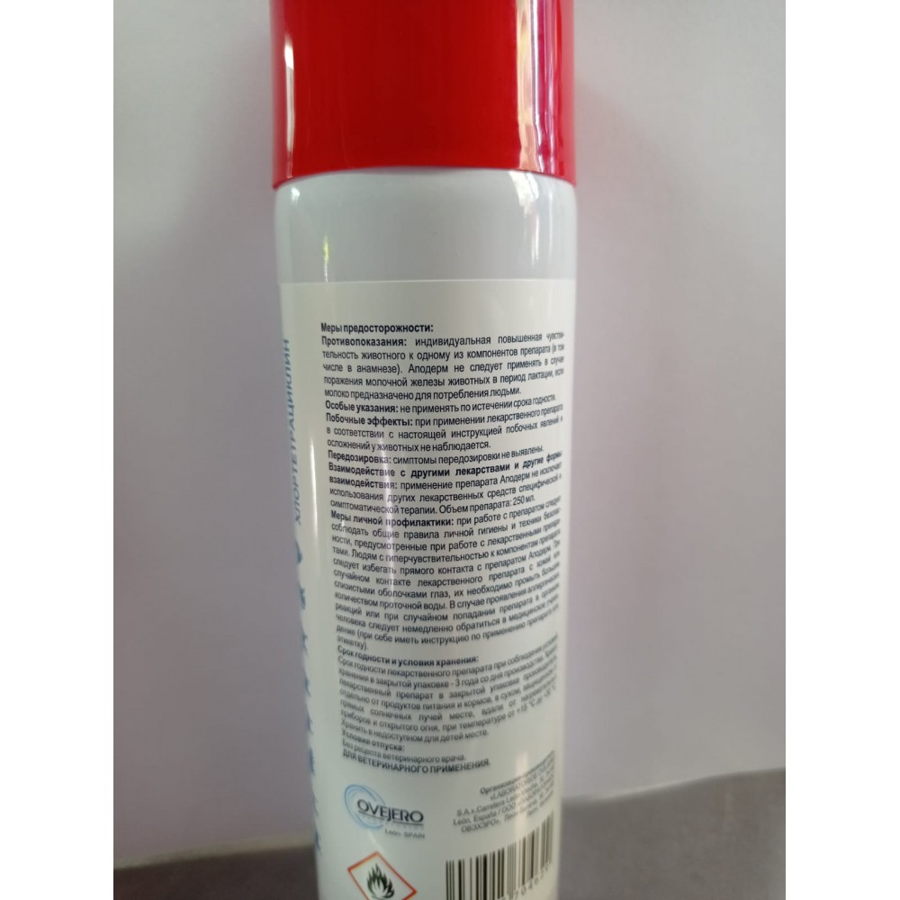Применение: Перед нанесением спрея проводят санитарную обработку пораженной поверхности. Затем флакон встряхивают и, держа его вертикально, распыляют Аподерм на пораженный участок с расстояния 15-20 см. Небольшие раны и/или царапины обрабатывают в течение 1-2 секунд один или два раза в сутки. При заболеваниях когтей и/или копыт препарат распыляют 2 раза с промежутком 30 секунд 1 раз в сутки. При дерматите кожи препарат распыляют 2 раза с интервалом 30 секунд 2 раза в сутки. Продолжительность лечения составляет от 3 до 8 дней, определяется ветеринарным врачом в зависимости от тяжести поражения и скорости заживления тканей.