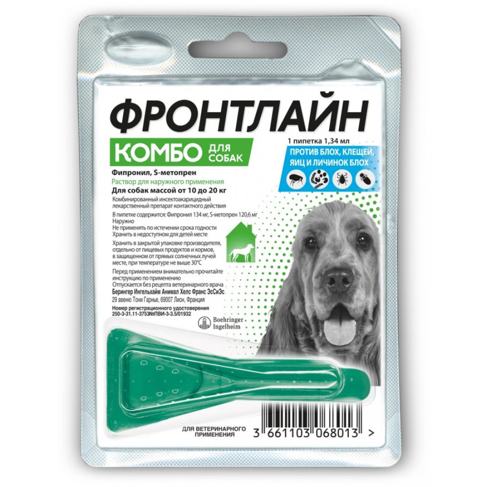 Фронтлайн Комбо М - инсектоакарицидные капли на холку контактного действия для собак весом до 10 - 20 кг. Фипронил 134 мг, S метопрен 120,6 мг.