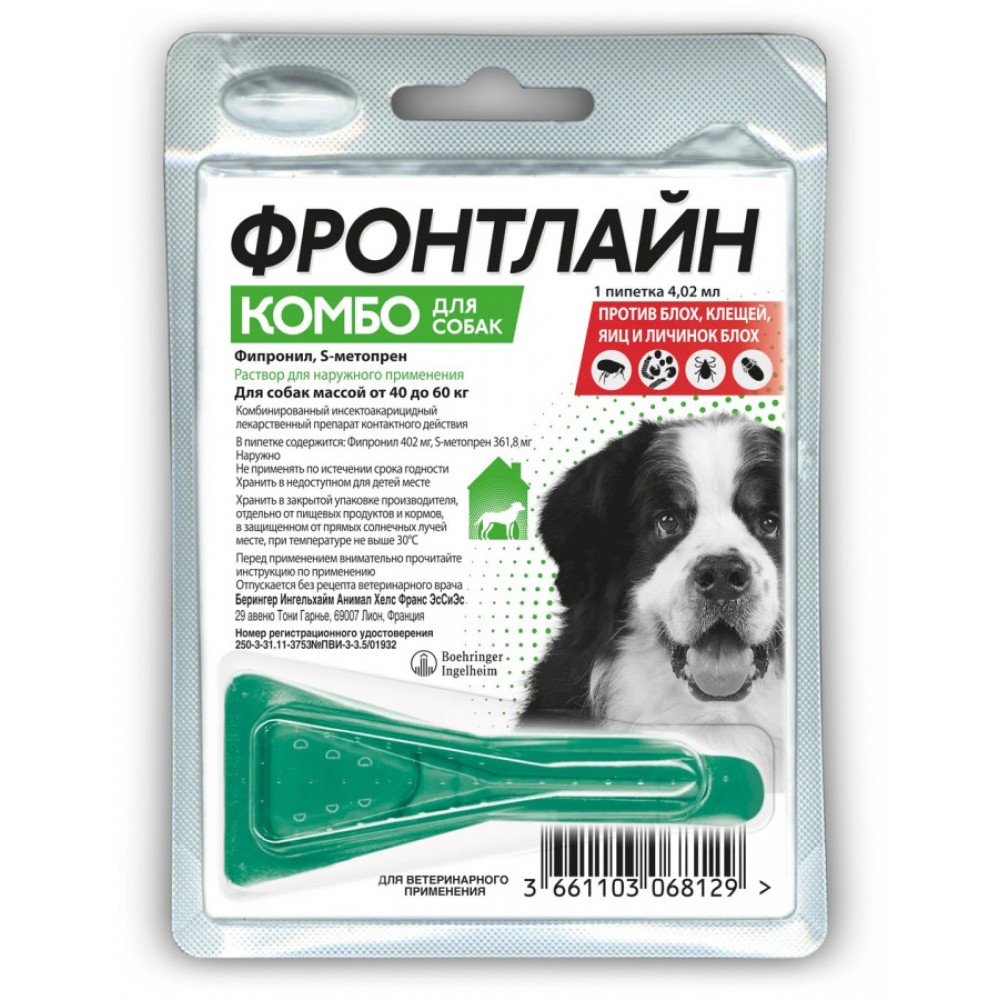 Фронтлайн Комбо XL - инсектоакарицидные капли на холку контактного действия для собак весом до 40 - 60 кг. Фипронил 402 мг, S метопрен 361,8 мг.