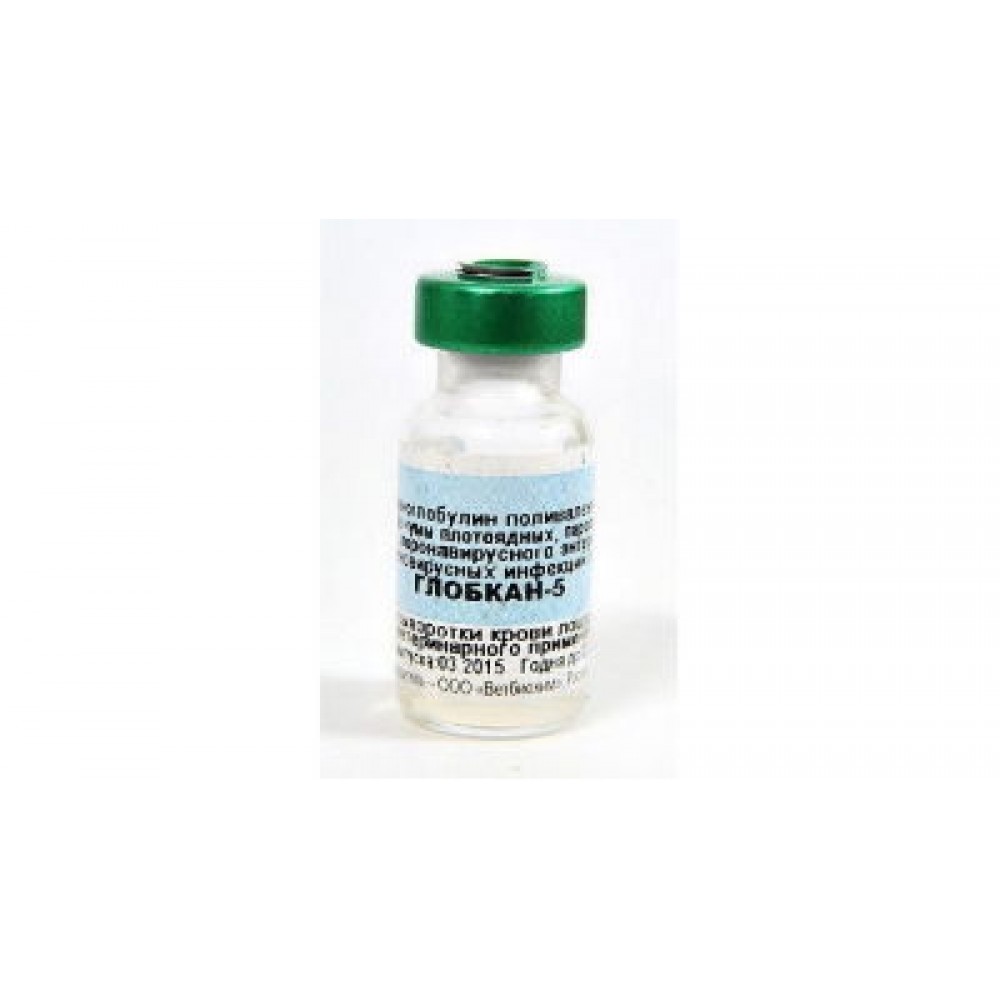 Глобкан-5 лекарственная форма раствор для инъекций. Один флакон 2 мл - 1 шт. Глобкан-5 состоит из высокоочищенной фракции глобулинов, выделенных из сыворотки крови лошадей, иммунизированных возбудителями чумы собак, парвовирусного и коронавирусного энтеритов и аденовирусных инфекций собак.