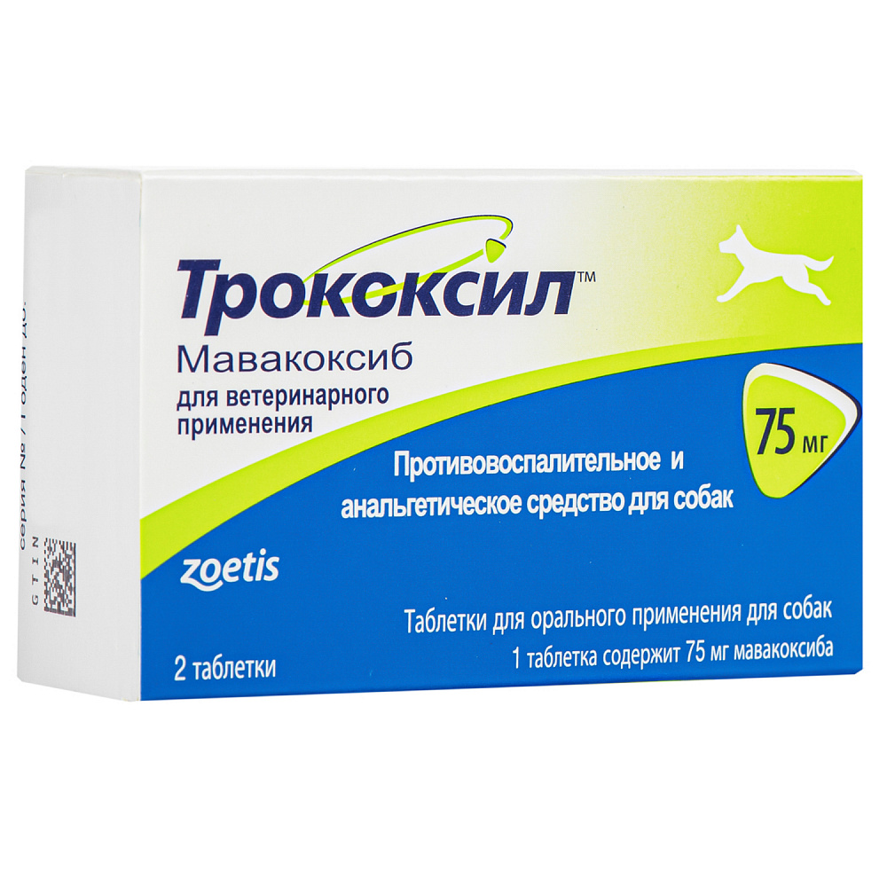 СПОСОБ ПРИМЕНЕНИЯ: Трококсил применяют собакам, начиная с 12 месячного возраста, перорально в дозе 2 мг мавакоксиба на 1 кг массы животного до или во время приема пищи. Повторно лекарственный препарат применяют через 2 недели после первого приема, а далее с интервалом 1 месяц. Курс лечения Трококсилом не должен превышать 7 приемов препарата, то есть 6,5 месяцев.