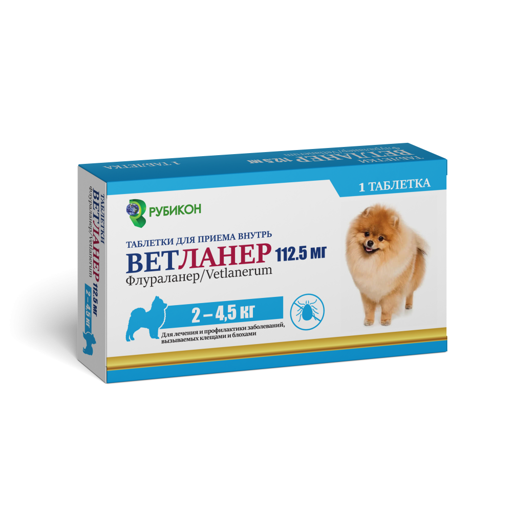 Ветланер - 112.5 мг (2 - 4.5 кг) таб для собак от клещей и блох. В составе препарата флураланер инсектоакарицид группы изоксазолина, активен в отношении иксодовых клещей (имаго и личинки Ixodes spp., Dermacentor spp., Rhipicephalus sanguineus), демодекозных клещей (Demodex canis), саркоптоидных клещей (Sarcoptes scabiei, Otodectes cynotis) и блох (Ctenocephalides spp.), паразитирующих на собаках. Проявляет высокую системную активность после прикрепления эктопаразитов к телу животного и начала питания. Механизм действия флураланера заключается в блокировании ГАМК-зависимых и глутамат-зависимых рецепторов членистоногих, гипервозбуждении нейронов, нарушении передачи нервных импульсов, что приводит к параличу и гибели эктопаразитов.