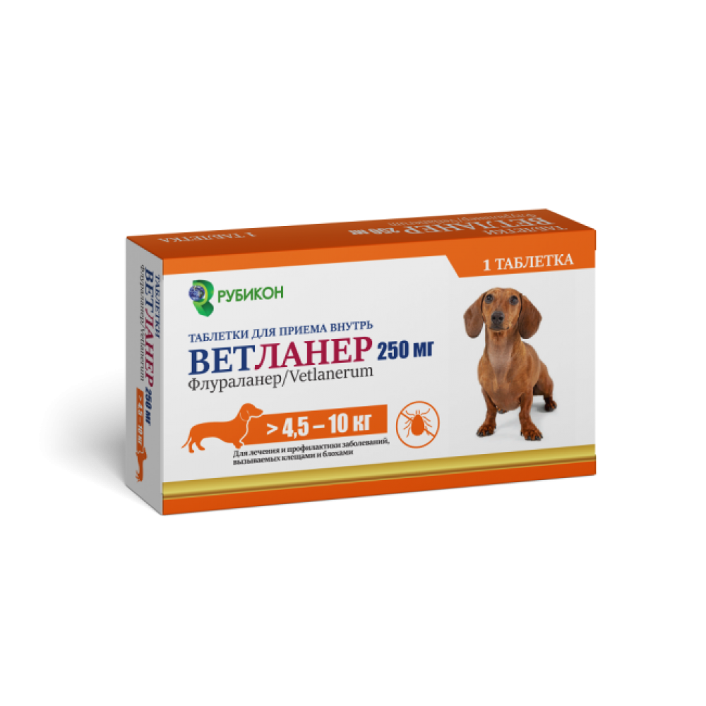 Ветланер - 250 мг (4.5 - 10 кг) таб для собак от клещей и блох. В составе препарата флураланер инсектоакарицид группы изоксазолина, активен в отношении иксодовых клещей (имаго и личинки Ixodes spp., Dermacentor spp., Rhipicephalus sanguineus), демодекозных клещей (Demodex canis), саркоптоидных клещей (Sarcoptes scabiei, Otodectes cynotis) и блох (Ctenocephalides spp.), паразитирующих на собаках. Проявляет высокую системную активность после прикрепления эктопаразитов к телу животного и начала питания. Механизм действия флураланера заключается в блокировании ГАМК-зависимых и глутамат-зависимых рецепторов членистоногих, гипервозбуждении нейронов, нарушении передачи нервных импульсов, что приводит к параличу и гибели эктопаразитов.